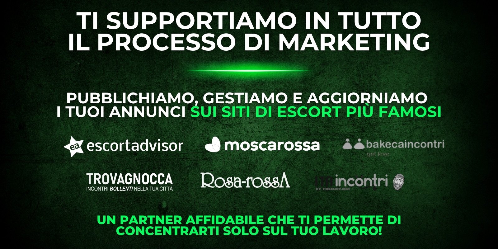 Il servizio è assolutamente sicuro e conforme alla legge. Ci occupiamo solo di marketing, grafica, contenuti, posizionamento e gestione dei profili pubblici. Non fissiamo appuntamenti, non gestiamo contatti privati e non interveniamo in alcuna attività offline. Offriamo esclusivamente servizi digitali professionali, così come previsto dalle normative italiane.